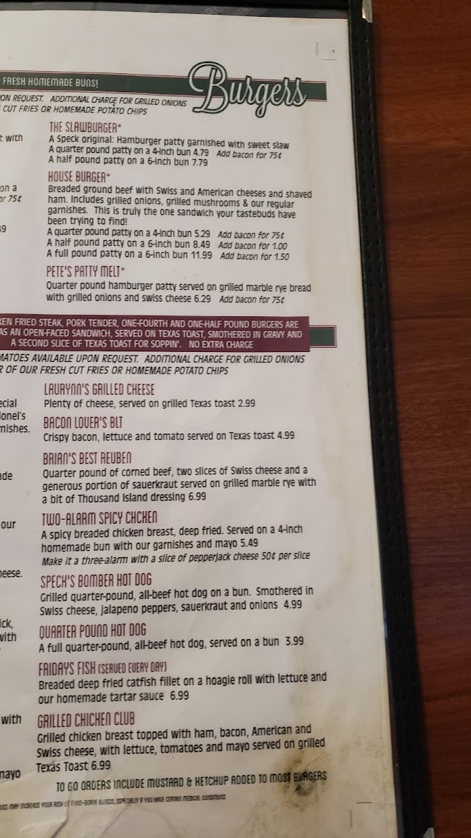 Welcome to Specks Bar & Grill, a gem located at 2105 SW Mission Ave, Topeka, KS, where juicy flavors meet hearty portions. Their menu offers an extensive variety of burgers that cater to every craving, ranging from the classic 1/2 Lb Cheeseburger at $12.99 to adventurous choices like the 3 Lb Cheese Burger for the bold eater at $48.99. Each burger is crafted to deliver satisfaction, alongside tasty wraps like the Buffalo Chicken Wrap and Grilled Chicken Wrap, both priced at $9.25.